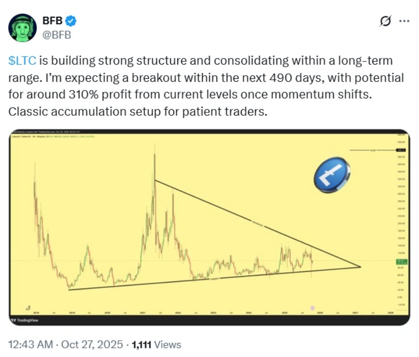 Анализ цены показывает довольно аккуратную структуру — LTC отскочил от минимума в $70 и теперь формирует более высокие минимумы, как будто тренируется к крипто-Олимпиаде. 💪 И, если Litecoin сможет закрыться выше $102 — представьте себе — сильный объём торгов может подтолкнуть его к $112, прежде чем стремиться к окончательной цели в $120. Ясный восходящий тренд. 🏆